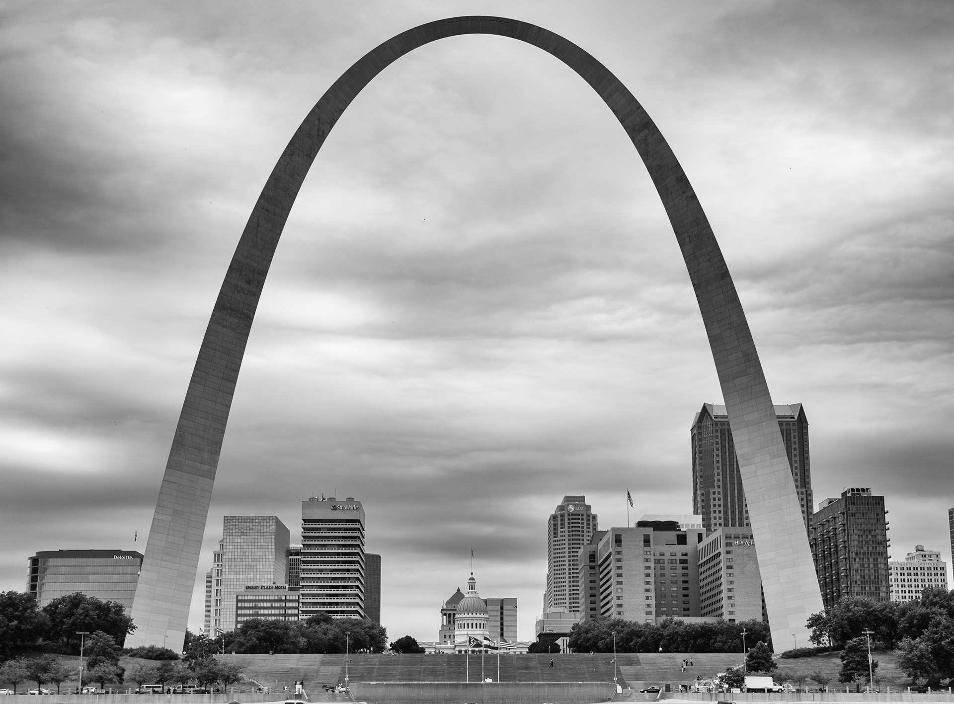 Photography of the St. Louis Arch and nearby old plants and bridges along the Mississippi River.